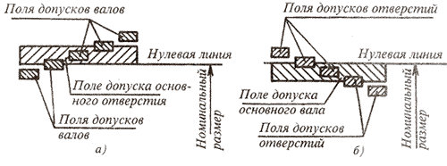 Посадки в системе отверстия - посадки, в которых требуемые зазоры и натяги получаются сочетанием различных полей допусков валов с полем допуска основного отверстия (рис. 3, а). Посадки в системе вала - посадки, в которых требуемые зазоры и натяги получаются сочетанием различных полей допусков отверстий с полем допуска основного вала (рис. 3, б).