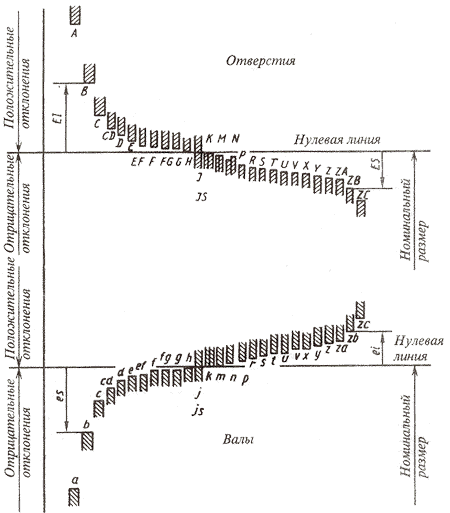 Основные отклонения обозначаются буквами латинского алфавита, прописными для отверстий (А ... ZC) и строчными для валов (а ... zc) (рис. 4).